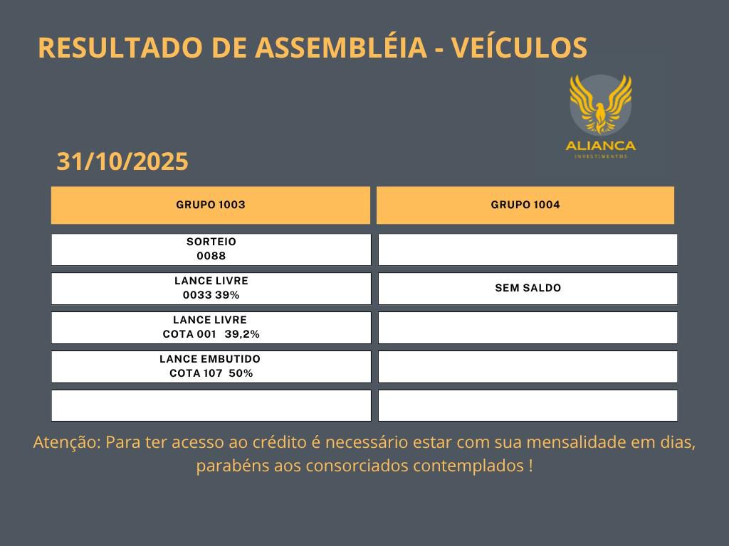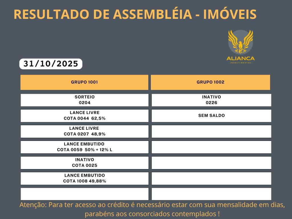 Confira abaixo os resultados da nossa última assembleia e acompanhe as contemplações do mês. Estamos sempre comprometidos em proporcionar transparência e segurança para você alcançar seus objetivos com o consórcio.